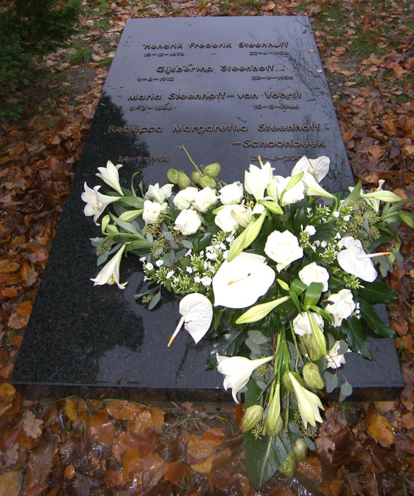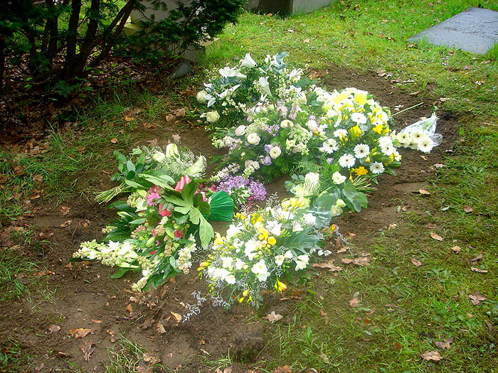 Bussum (Nederland). Rebecca werd begraven in een familiegraf (dat was haar wens). De kist is begraven en de bloemen zijn in het zand erboven geplant. De plek wacht op de grafsteen. |